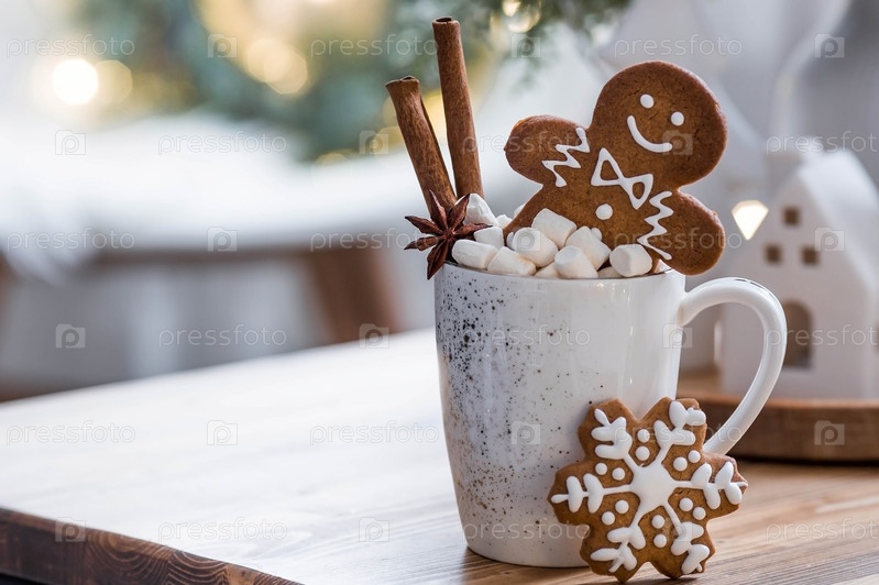 Рождественское имбирное печенье в домашних условиях в сахарной пудре. Вкусный рыжий человечек в кружке с кофе и зефиром на фоне боке елочных огней. Свежеиспеченные имбирные пряники