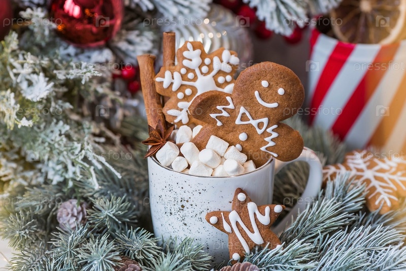 Рождественское имбирное печенье в домашних условиях в сахарной пудре. Вкусный рыжий человечек в кружке с кофе и зефиром на фоне боке елочных огней. Свежеиспеченные имбирные пряники
