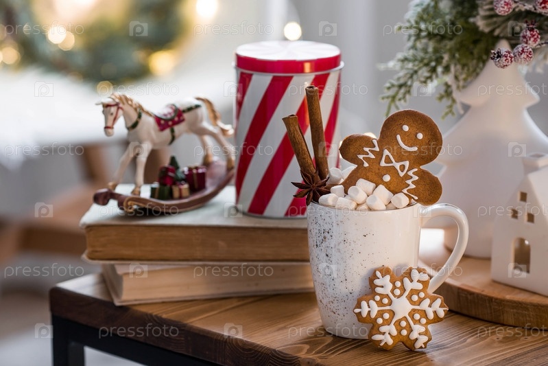 Рождественское имбирное печенье в домашних условиях в сахарной пудре. Вкусный рыжий человечек в кружке с кофе и зефиром на фоне боке елочных огней. Свежеиспеченные имбирные пряники
