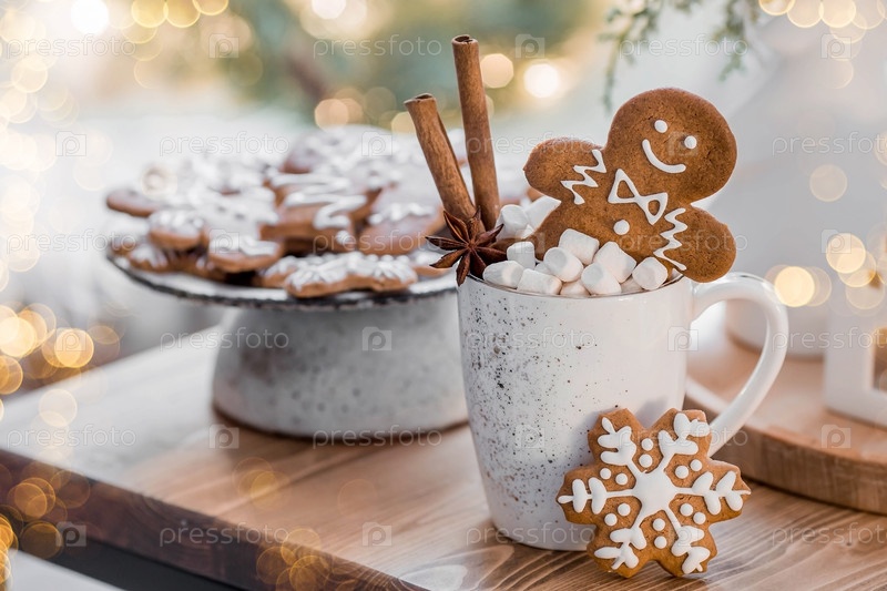 Рождественское имбирное печенье в домашних условиях в сахарной пудре. Вкусный рыжий человечек в кружке с кофе и зефиром на фоне боке елочных огней. Свежеиспеченные имбирные пряники