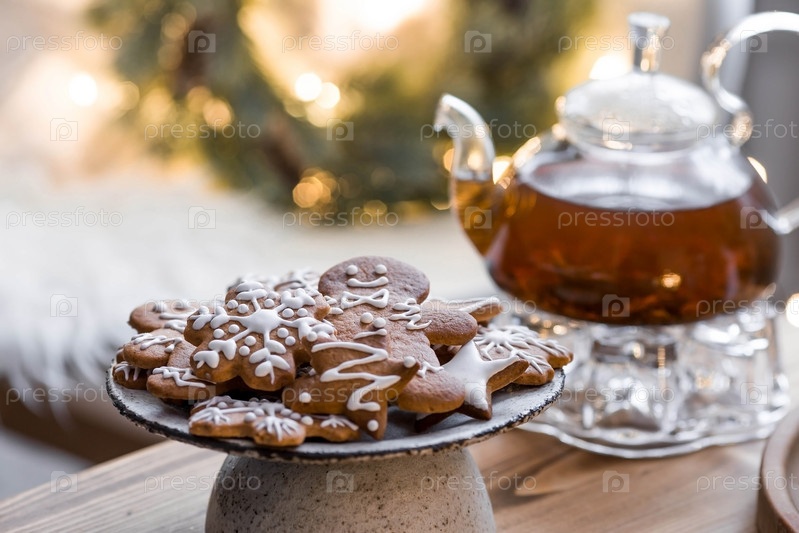 Рождественские пряники домашнего приготовления в сахарной пудре. Вкусные пряники на фоне боке елочных огней. Свежеиспеченные рождественские пряники