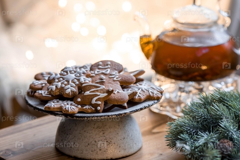 Рождественские пряники домашнего приготовления в сахарной пудре. Вкусные пряники на фоне боке елочных огней. Свежеиспеченные рождественские пряники