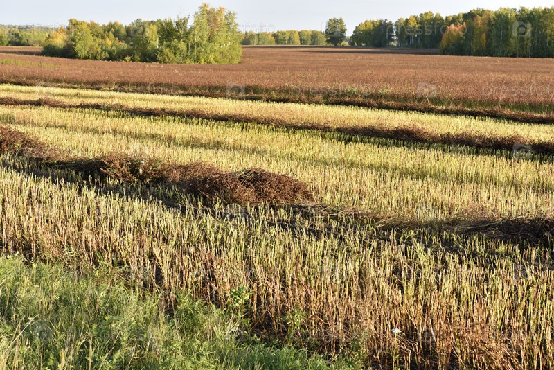 Гречишное поле в солнечный осенний день. Сбор урожая в поле