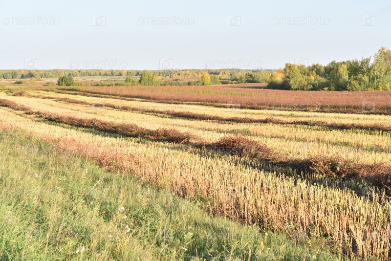 Гречишное поле в солнечный осенний день. Сбор урожая в поле