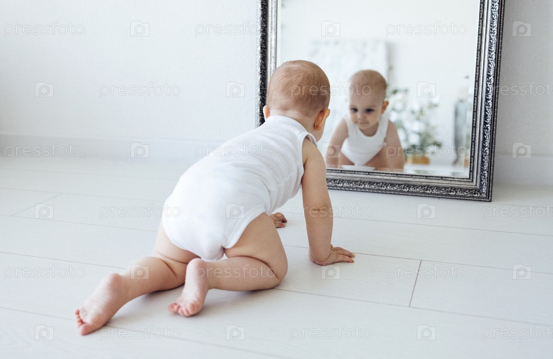 Милая малышка в белом боди ползет по полу к зеркалу. Отражение милого младенца в зеркале с красивой рамкой