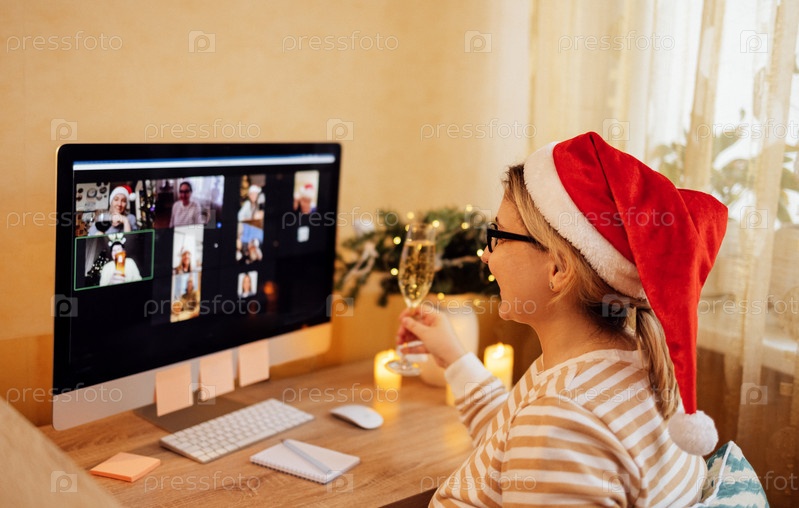 Молодая женщина в шляпе Санты радостно общается по видеосвязи с друзьями