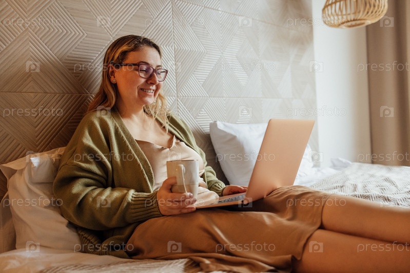 Молодая женщина в очках сидит на кровати и работает за ноутбуком