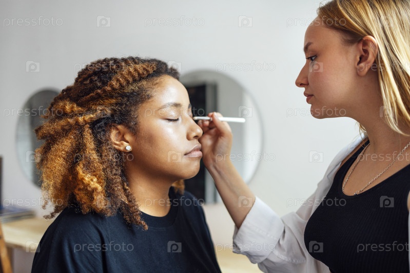 Кавказская блондинка-мастер делает макияж для своей темнокожей клиентки в салоне красоты