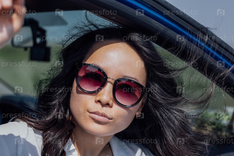 Крупный план женского портрета молодой привлекательной азиатки в машине. Очаровательная кореянка в стильных солнцезащитных очках на открытом воздухе