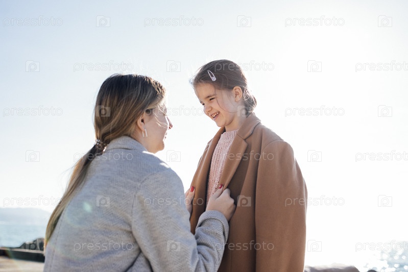 Две милые сестры обнимаются на свежем воздухе. Красивые девушки в пальто на фоне голубого неба