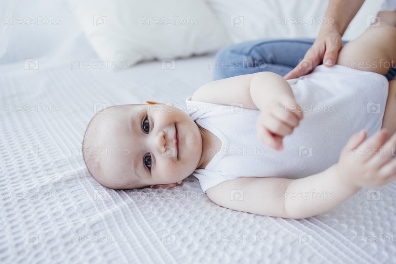 Симпатичный младенец в белом боди со своей мамой на светлом фоне