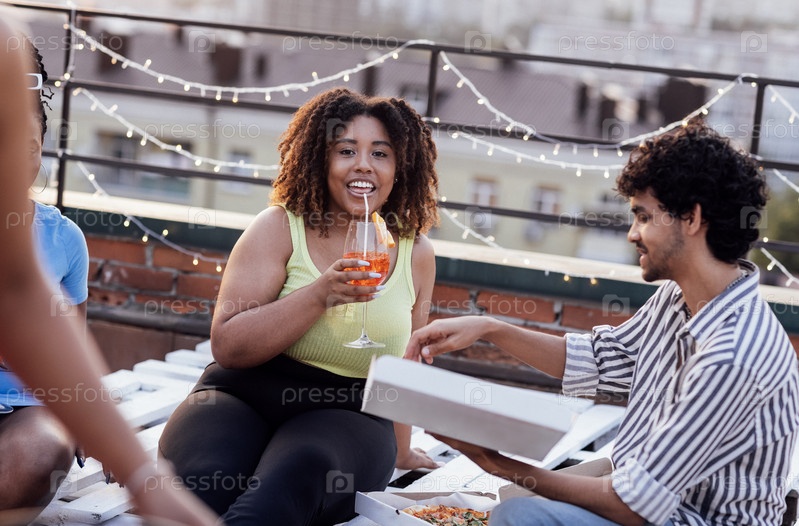 Четверо веселых друзей едят пиццу и наслаждаются вкусными коктейлями