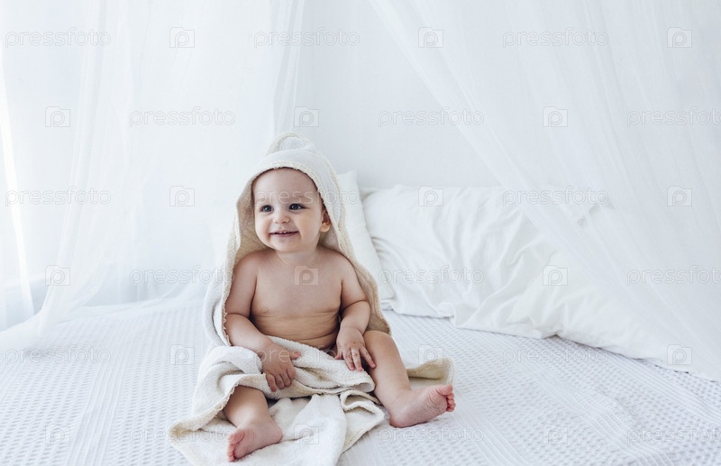 Маленький милый ребенок в полотенце с капюшоном после ванны или душа дома