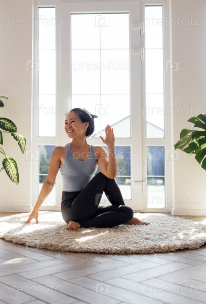 Милая молодая азиатка в фитнес-костюме улыбается и занимается йогой в гостиной. Привлекательная женщина сидит в позе короля рыб и занимается физическими упражнениями