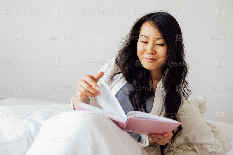 Привлекательная молодая азиатка лежит в постели на подушках и читает книгу. Очаровательная кореянка отдыхает на диване в спальне