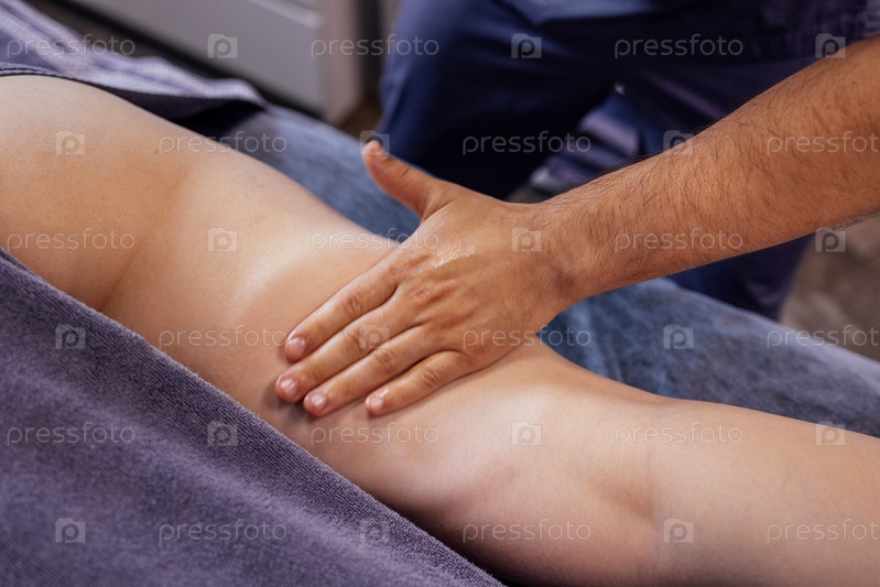 Крупный план рук массажиста, делающего массаж ног клиентке в центре красоты. Антицеллюлитный массаж в клинике