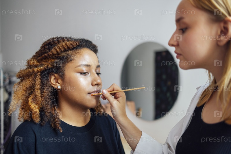 Кавказская блондинка-мастер делает макияж для своей темнокожей клиентки в салоне красоты