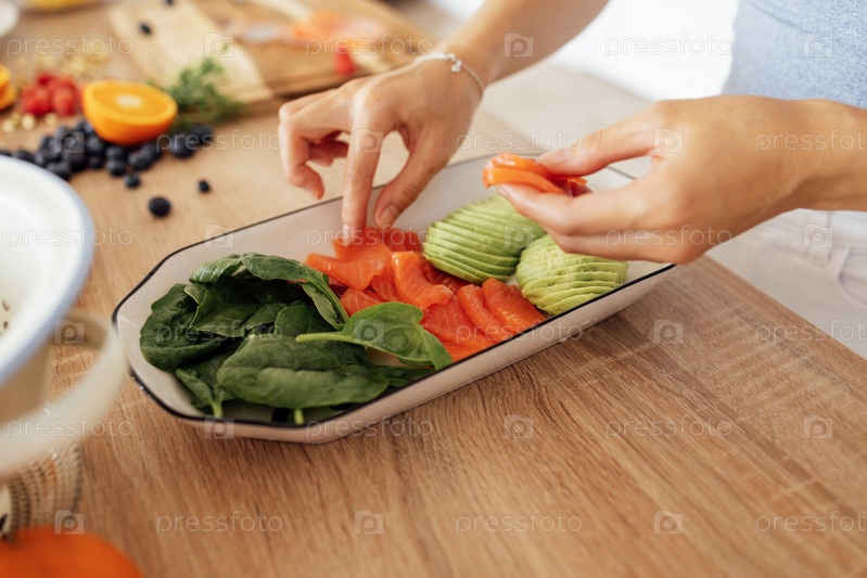 Привлекательная милая азиатка улыбается и готовит завтрак на кухне. Молодая очаровательная кореянка смеется и режет овощи и рыбу. Здоровая пища. Уютный современный интерьер комнаты