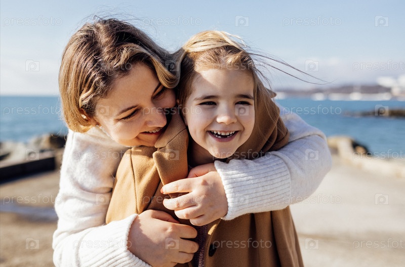 Улыбающаяся мать обнимает свою милую смеющуюся дочь на берегу моря. Молодая женщина надевает теплое пальто для своего ребенка на пляже