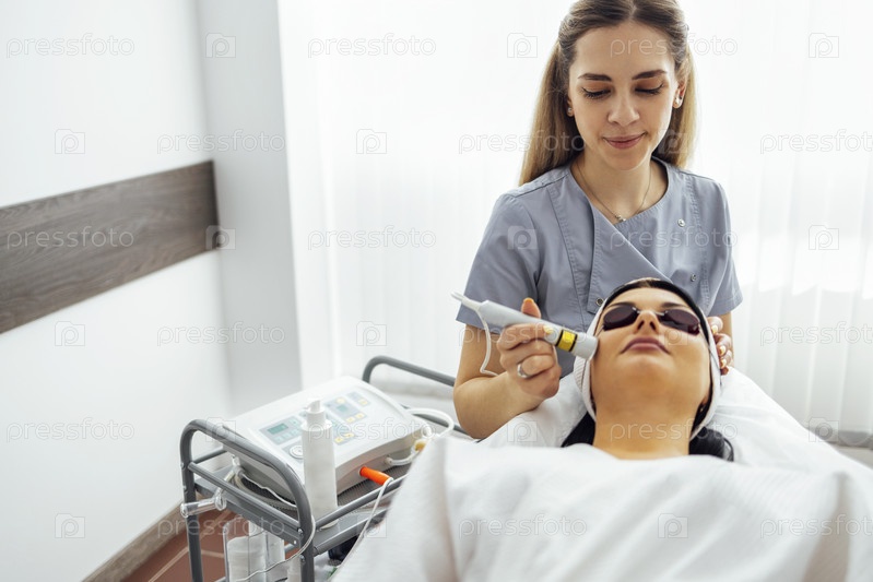 Крупный план лица красивой расслабляющей девушки, проходящей процедуру аппаратной косметологии в спа-салоне