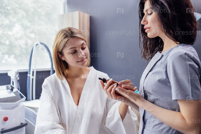 Симпатичная кавказская косметолог общается со своей клиенткой