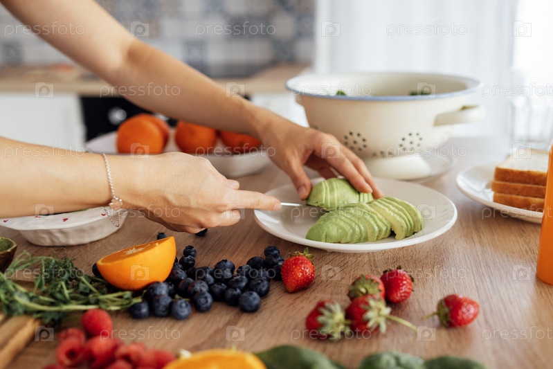 Привлекательная милая азиатка улыбается и готовит завтрак на кухне. Молодая очаровательная кореянка смеется и режет овощи и рыбу. Здоровая пища. Уютный современный интерьер комнаты
