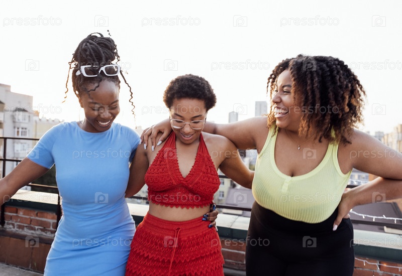 Три очаровательные афроамериканки танцуют на крыше многоэтажного дома. Привлекательные темнокожие подруги веселятся вместе