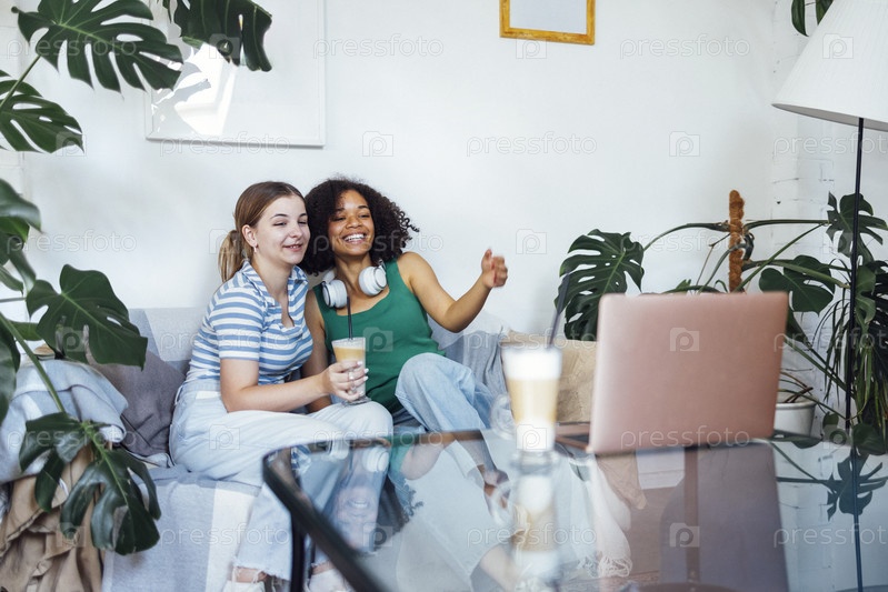 Два симпатичных подростка разных национальностей пьют капучино и общаются по видеосвязи
