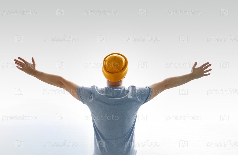 Молодой человек в серой рубашке и желтой шляпе стоит, вытянув руки. Почувствуйте свободу