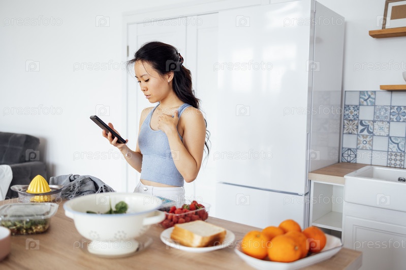 Молодая привлекательная азиатка пользуется телефоном и ищет рецепт блюда в Интернете. Очаровательная кореянка готовит еду на кухне дома