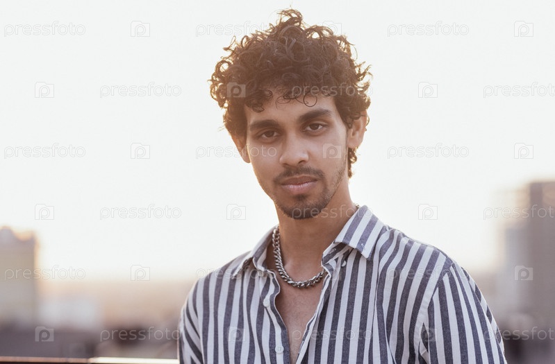 Привлекательный кудрявый парень в полосатой рубашке улыбается на заднем плане