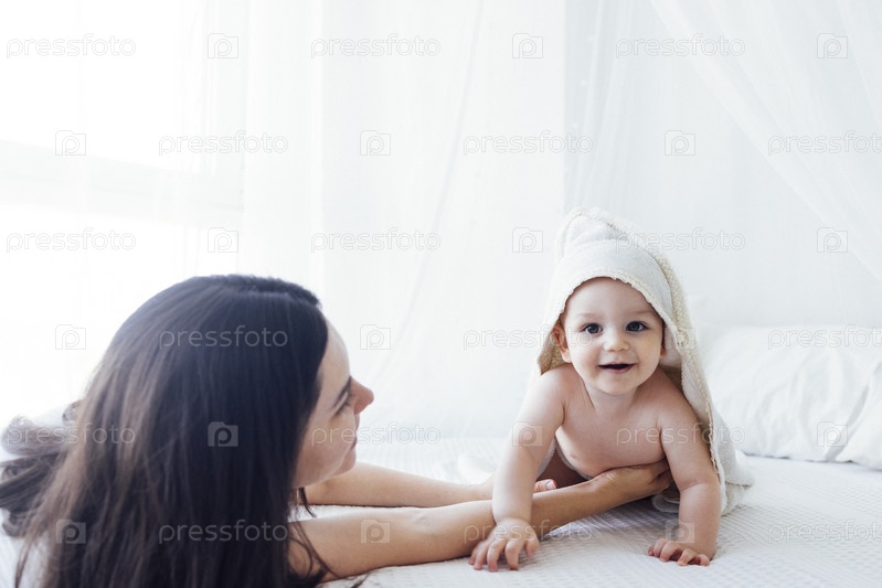 Милый милый малыш сидит на кровати рядом со своей мамой и играет после ванны