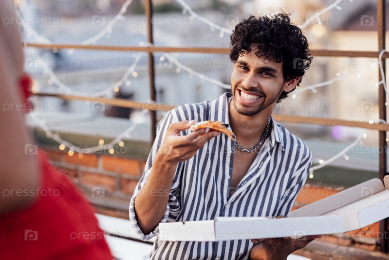 Симпатичный парень смешанной расы улыбается и держит в руке кусок пиццы. Молодой латиноамериканец с вьющимися волосами смеется в полосатой рубашке и перекусывает