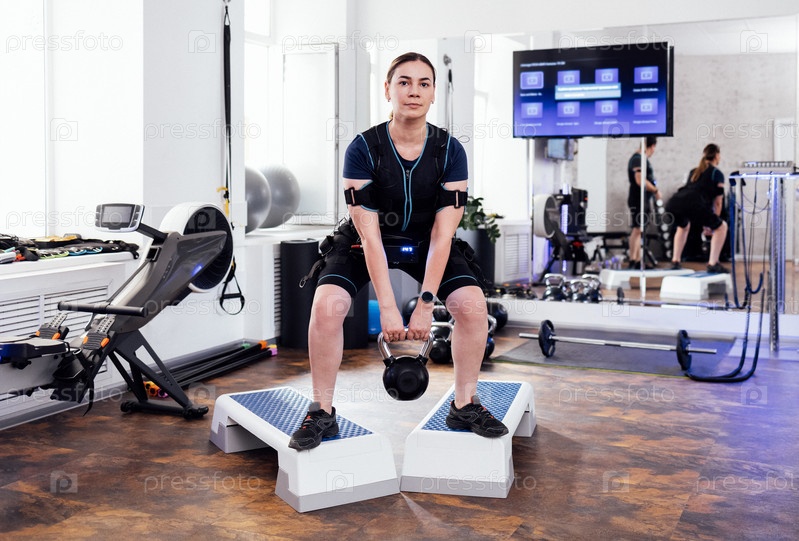 Молодая женщина в костюме ems стоит на ступеньках и делает приседания с гирями.Спортсменка сидит со своим весом в современном тренажерном зале