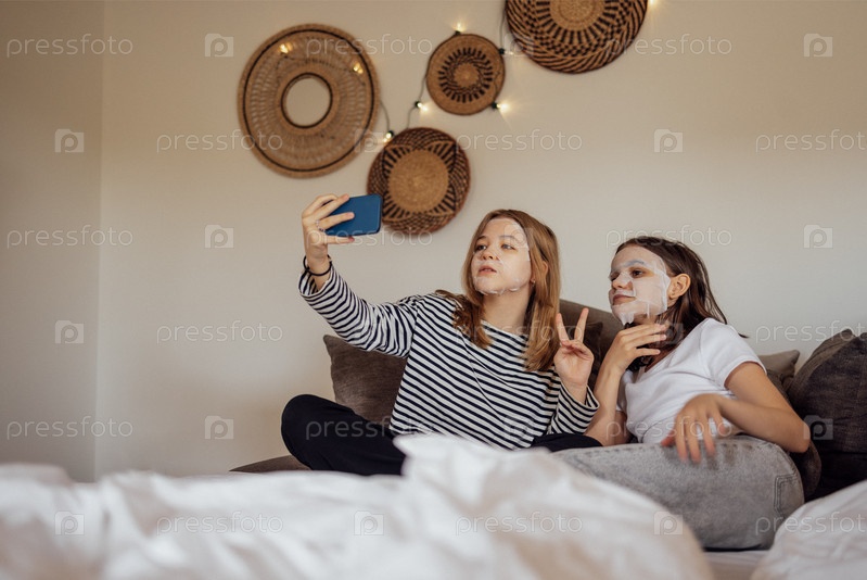 Две симпатичные девочки-подростки с одноразовыми тканевыми увлажняющими косметическими масками на лицах делают селфи