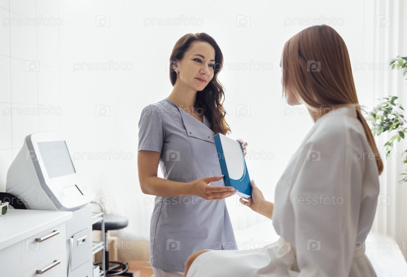 Симпатичная кавказская косметолог общается со своей клиенткой