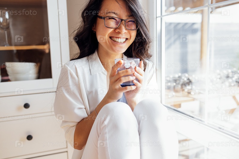 Счастливый молодой азиат сидит в гостиной и пьет воду. Привлекательная девушка держит чашку и смеется