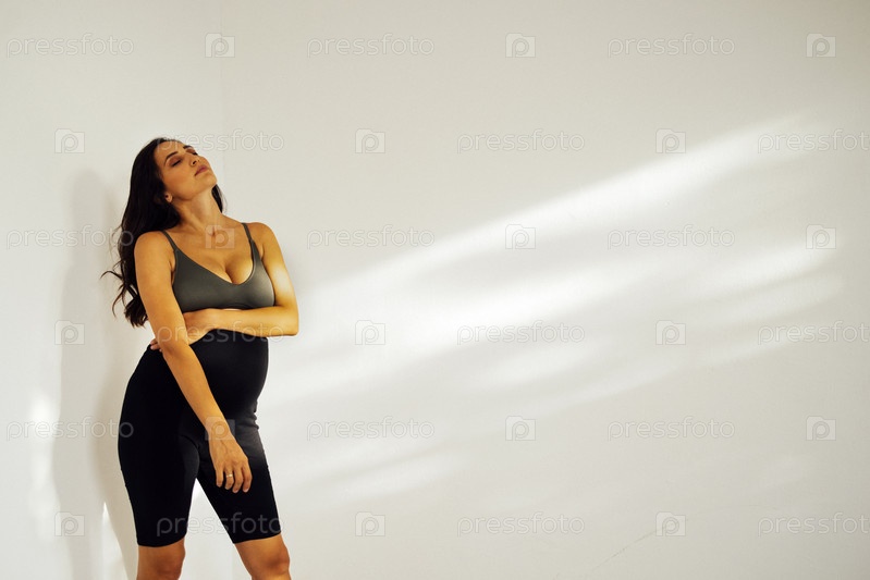 Красивая беременная женщина в темной одежде стоит боком у белой стены