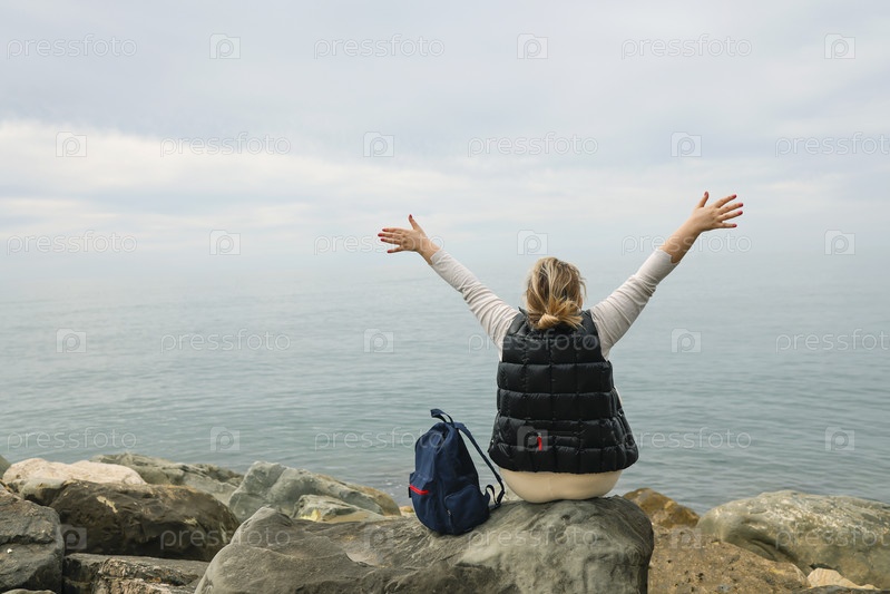 Молодая женщина в повседневной одежде и черном рюкзаке раскинула руки, сидя на берегу моря