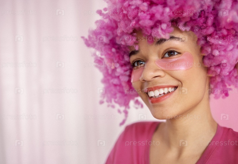 Крупный план портрета привлекательной счастливой темнокожей девушки с нежно-розовым вьющимся париком