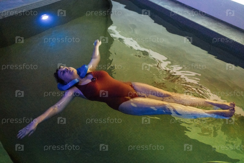 Молодая женщина в красном купальнике плавает в бассейне. Привлекательная пухлая девушка наслаждается спа-процедурой в соляной комнате