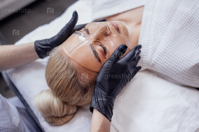 Блондинка красивая девушка в белом халате проходит процедуру увлажнения кожи