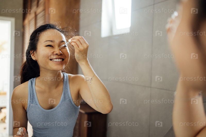 Милая улыбающаяся азиатская молодая женщина наносит увлажняющую сыворотку из пипетки на лицо, стоя перед зеркалом. Милая очаровательная кореянка, ухаживающая за своей кожей