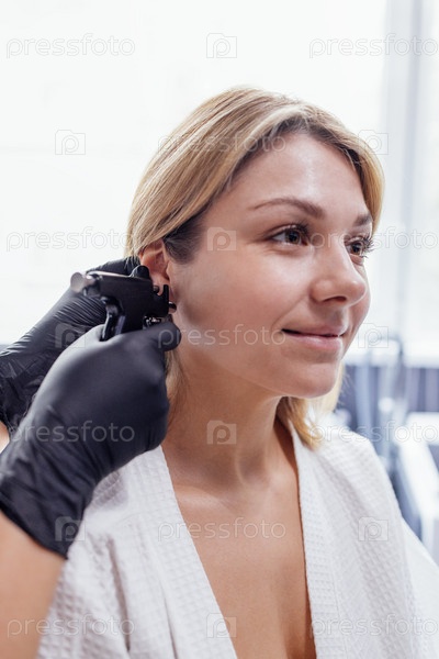 Крупный план лица молодой блондинки, делающей процедуру пирсинга ушей