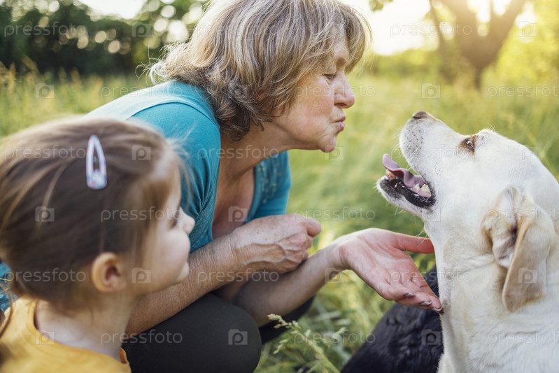 Седая бабушка и милая маленькая внучка вместе выгуливают собак в парке