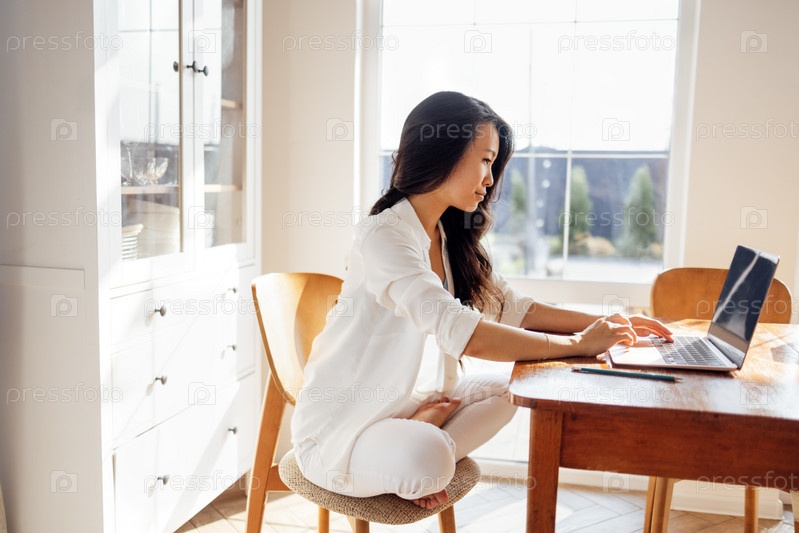 Молодая очаровательная азиатка работает за столом с ноутбуком в столовой. Милая кореянка учится онлайн дома. Привлекательная деловая женщина общается по видеосвязи