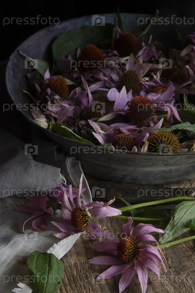 Сырье свежих цветов фиолетового эхинацеи в старинной медной тарелке, готовое к сушке