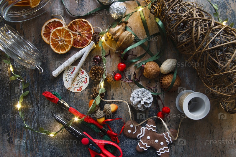 Изготовление домашней гирлады из натуральных материалов - сухие апельсиновые чипсы, имбирное печенье, арконы, ленты, палочки корицы и сосновые шишки, экологически чистые, на деревянном столе с огнями, плоская планировка