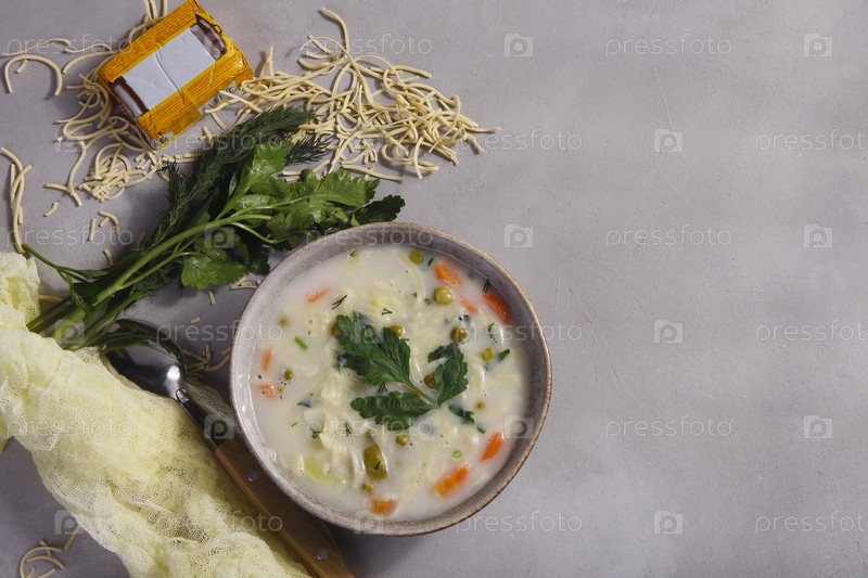 Суп из плавленого сыра с зеленым горошком и лапшой со свежей зеленью на сером фоне, вид сверху с ингредиентами, пространство для копирования
