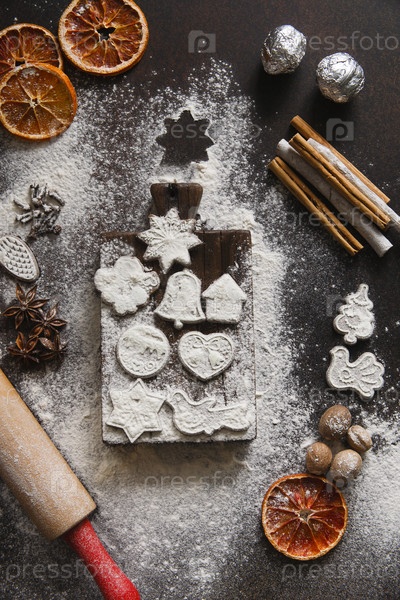 Рождественские пряники на темном фоне, белая мука в форме елки, сухие апельсины, специи и скалка, плоская планировка